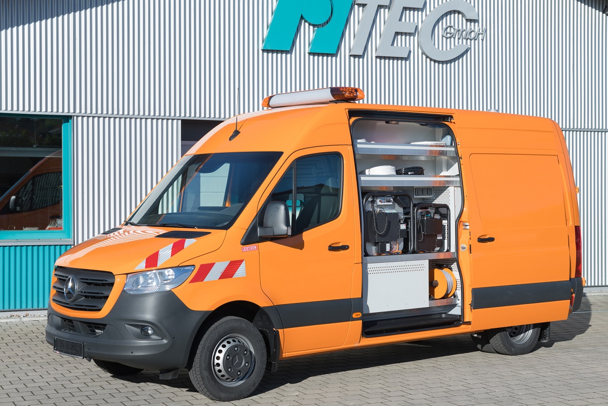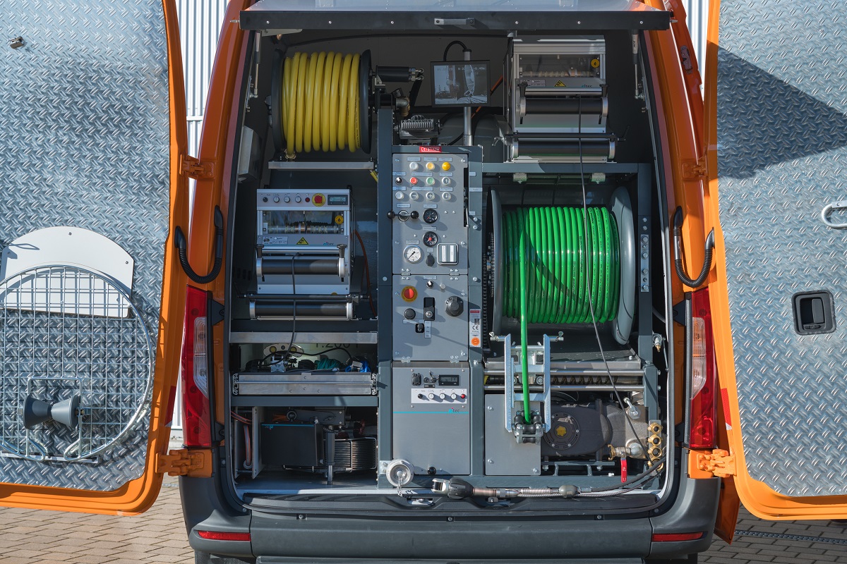 Dieses Kombinationsfahrzeug - hier am Beispiel Mercedes Sprinter - ausgestattet mit TV-Inspektionstechnik und Hochdruckspüler, ermöglicht Inspektionen in Hauptkanälen, Anschlussleitungen und Grundstücksentwässerungsanlagen (GEA). Sämtliche Haltungen sowie Leitungen können vor der Inspektion gereinigt werden.